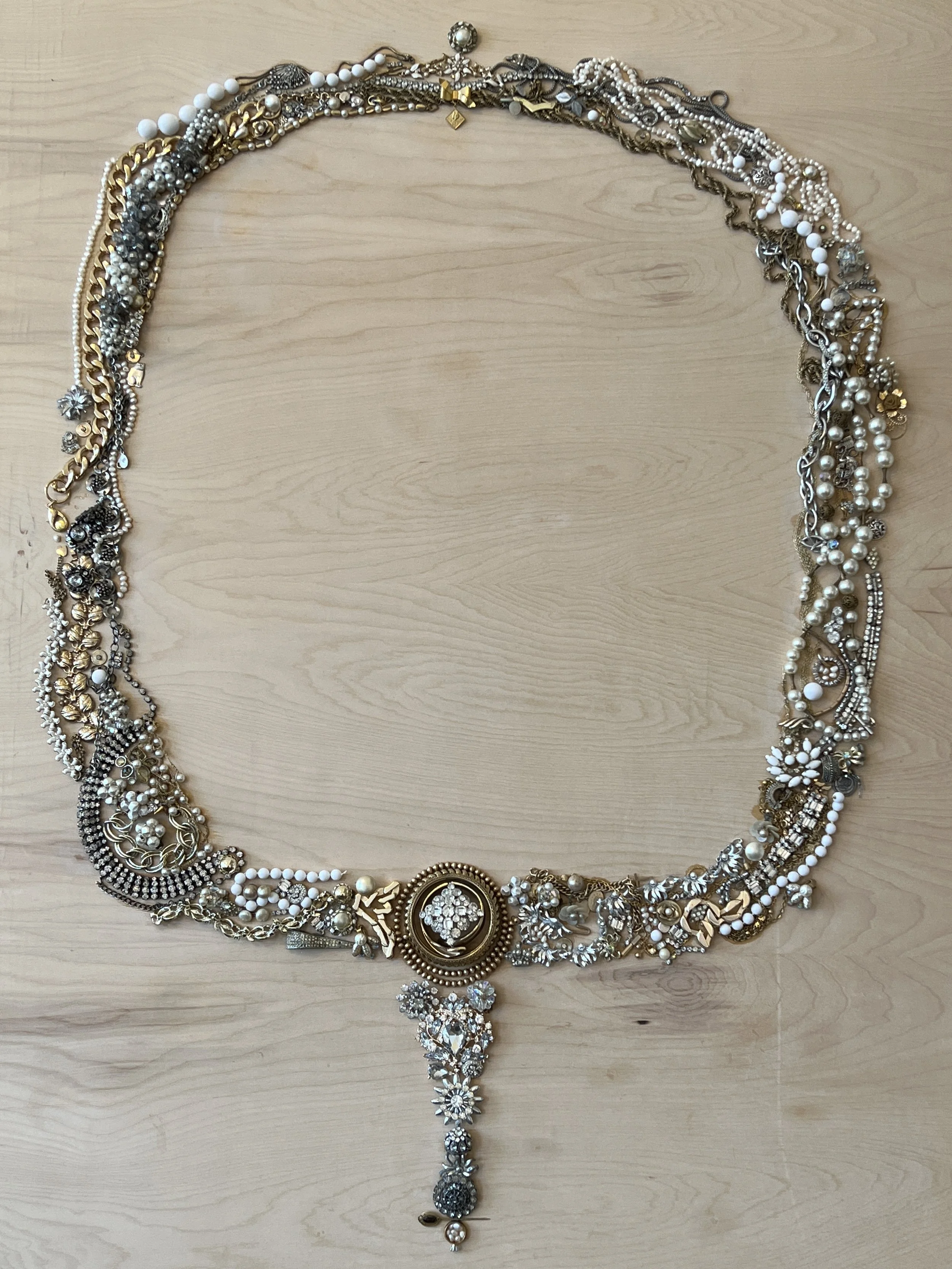 In summer 2022, I had just moved to Hudson, Ohio and Buy Nothing was one of my first interactions with the Hudson community. Buy Nothing groups are small communities of neighbors who give each other things that they don’t need anymore. It’s the online version of borrowing a cup of sugar and two eggs from your neighbor when you’re in the middle of baking. I remember my mother doing this very thing long before Facebook was ever thought of. So, I asked the community to donate their old and broken costume jewelry to make a gigantic necklace. The act of creating the necklace and the group donations and encouragement are all part of the final necklace itself. It’s not just the final product that’s important, but all the people that interacted with it during its making. The focus of Buy Nothing groups is on the community and the collective. I’d like to attribute authorship of this gigantic necklace to include all the people of the Hudson Buy Nothing Facebook group. This project could not have come into being without the community’s support. The memories of their mothers, their children, and their own hopes and dreams are embodied in this jewelry.
