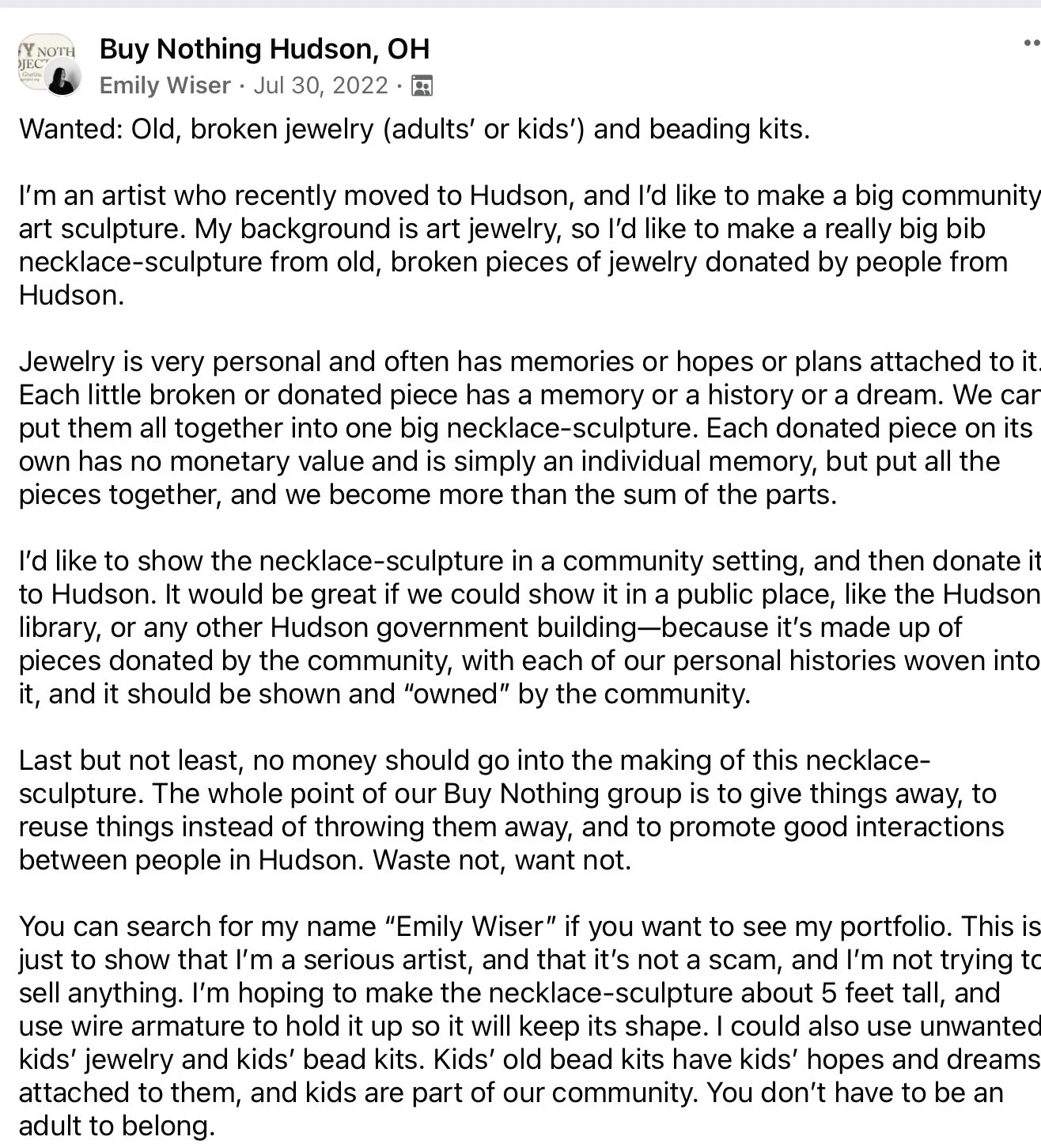 Call for Donated Costume Jewelry on the Facebook Buy Nothing Hudson group. On Buy Nothing groups, posters aren’t allowed to sell anything or link to any websites that sell things. So, I’ve asked them to google my name instead. July 2022.