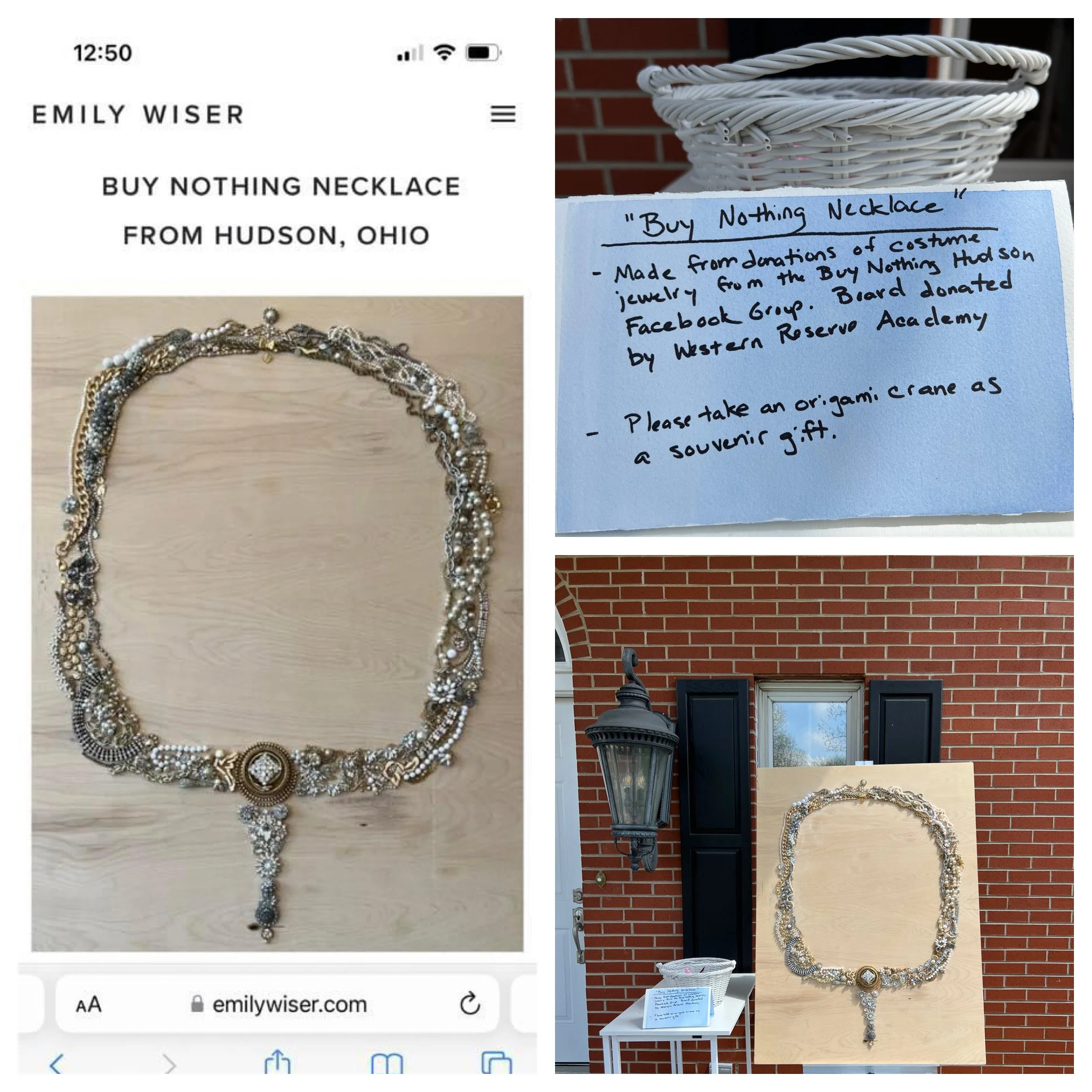 So, I made a very large Buy Nothing Necklace from hundreds of pieces of donated costume jewelry from the Hudson Buy Nothing Facebook group. Western Reserve Academy donated the big board for me to glue on all the jewelry. This project could not have come into being without the community’s support. Thank you so much to everyone who contributed.